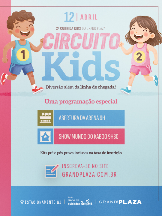 Vem aí a 2ª Corrida Kids do nosso Grand, um circuito feito para a criançada se divertir, correr e cruzar a linha de chegada com sorriso no rosto.
